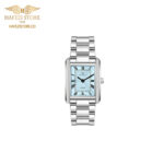 صفحه ساعت به رنگ امروزی تیفانی طراحی شده است که در حاشیه های آن از نگین های مخراج کاری شده برای لاکچری شدن ساعت استفاده شده است. قاب و بند ساعت نیز به رنگ نقره ای ساعت که ترکیب تمامی این رنگ ها و طرح ها ساعتی لاکچری، کلاسیک و مناسب برای استفاده در مجالس را برای شما به ارمغان آورده است.