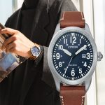 ساعت مچی مردانه سیتیزن | مدل BM6838-33L، در بند خود از چرم طبیعی ساده دست دوز به رنگ قهوه ای استفاده کرده است.